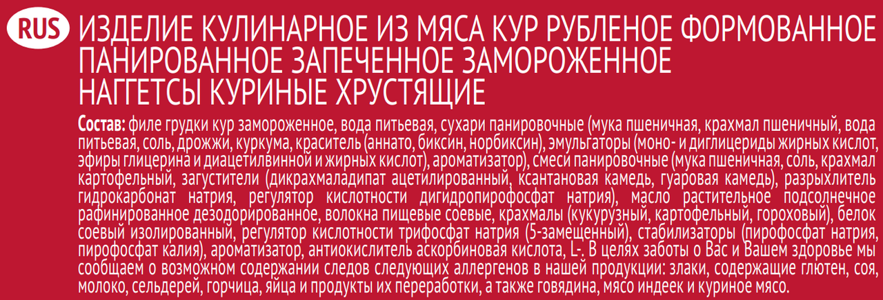 Мясо куриное, вода питьевая, мука пшеничная, масло растительное подсолнечное рафинированное дезодорированное, крахмалы гороховый, картофельный, волокна пищевые клетчатка соевая, белок соевый, соль, загуститель гуаровая камедь, регулятор кислотности E451i, стабилизаторы Е450iii, Е450v, дрожжи, куркума, ароматизатор натуральный, антиокислитель кислота аскорбиновая, краситель аннато.