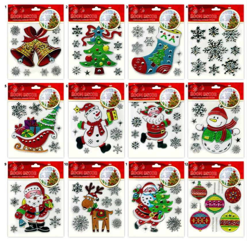Наклейка с новогодними принтами в ассортименте. Размер с упаковкой: 21 х 17 см. Материал: ПВХ + блестящая фольга.В ассортименте 12 дизайнов.