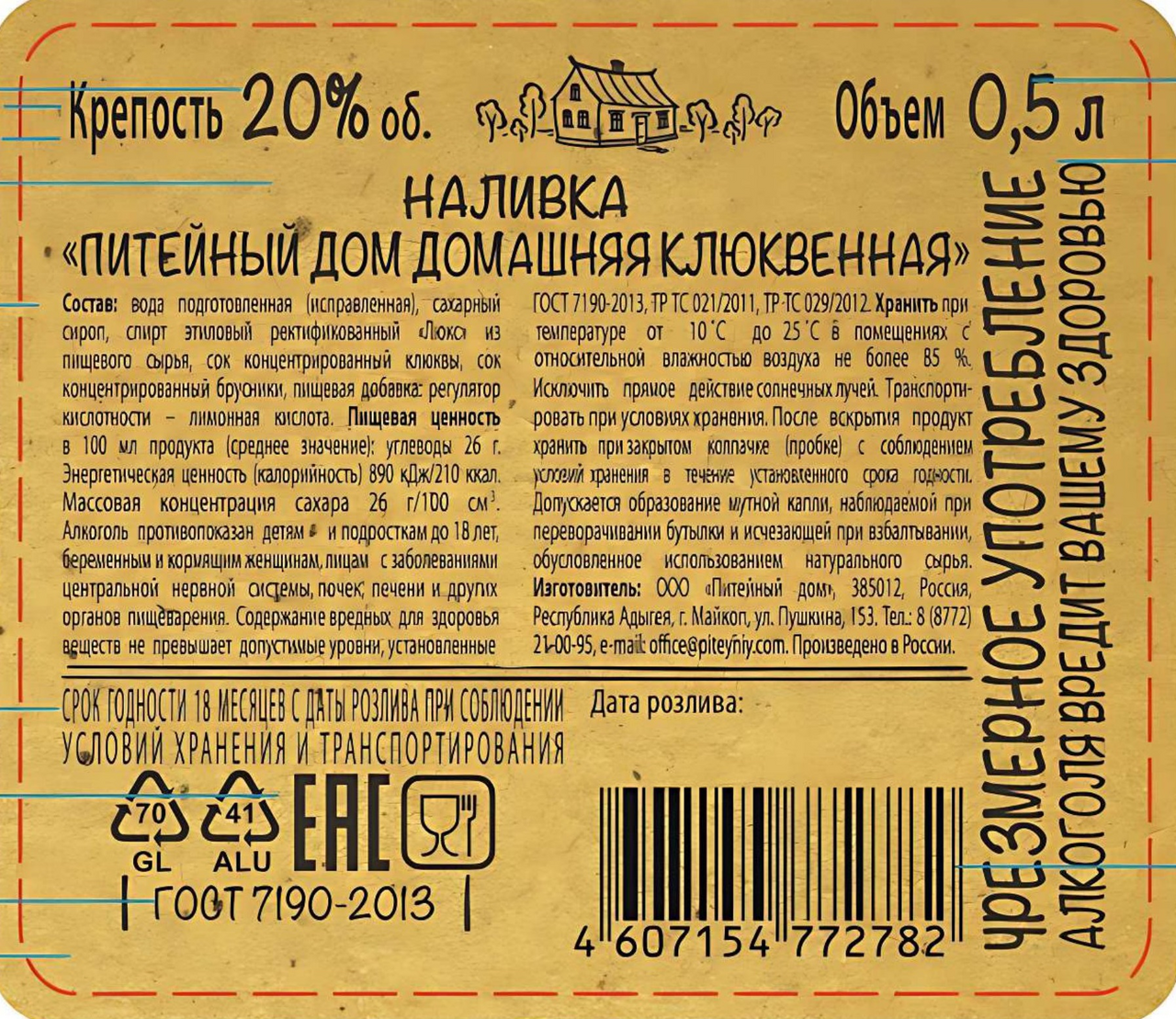 Бережное отношение к каждой бутылке подчеркнуто кустарным бумажным колпачком, обвязанным вручную бечёвкой с пломбой. Яркая этикетка, наполненная яркими, сочными вишенками притягивает внимание покупателя. Настойку производят на основе высококачественного спирта, клюквенного морса и ледниковой воды из национального заповедника плато Лаго-Наки. Настойка бутилируется в уникальную бутылку с тактильной этикеткой, бумажным декоративным колпачком, шпагатной нитью и пломбой. Настойку можно пить в чистом виде, в паре с закусками или использовать для приготовления коктейлей.