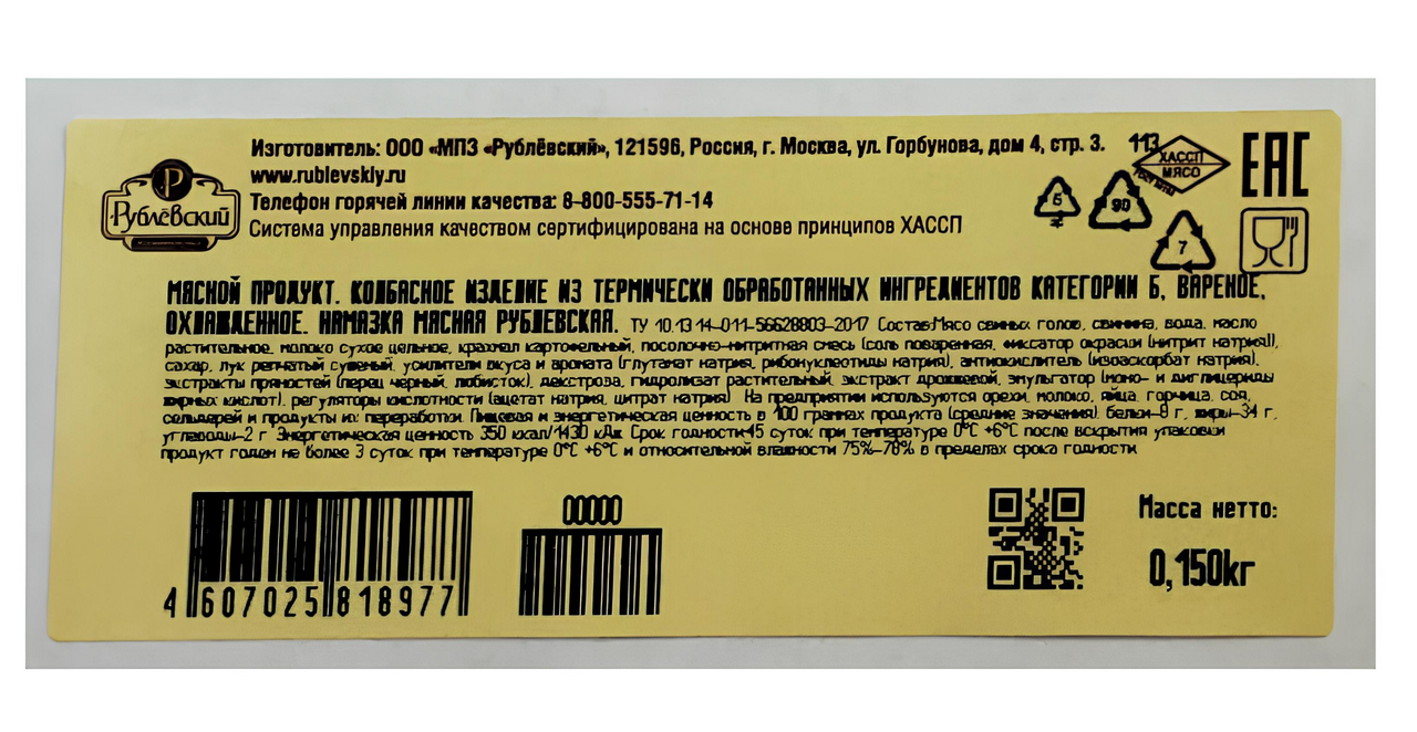 Намазка мясная Рублевский вареная, 150г