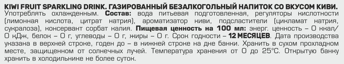 Вода питьевая подготовленная, регуляторы кислотности (лимонная кислота, цитрат натрия), ароматизатор киви, подсластители (цикламат натрия, сукралоза), консервант сорбат калия.