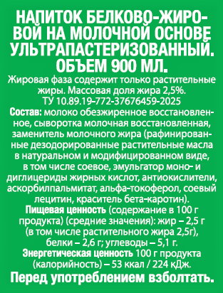 Напиток белково-жировой Эконом ультрапастеризованный 2.5%, 900мл