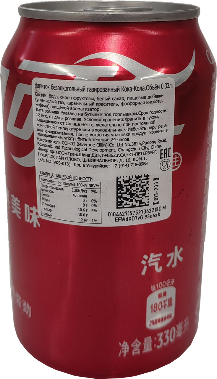 Напиток Coca-Cola газированный, 330мл x 24 шт - легендарный американский напиток, придуманный аптекарем из Атланты Джоном Пэмбертоном в 1886 году и известный более чем в 200 странах мира. В его состав входит вода, прошедшая многоступенчатую очистку, карамельный колер, углекислый газ для пузырьков и колючего вкуса, сахар (10.6г на 100мл), ортофосфорная кислота для кислинки, кофеин (меньше 15мг на 100мл) и самое главное - секретная композиция натуральных ароматизаторов и специй, которая и делает вкус напитка таким уникальным и освежающим. Самостоятельный сладкий освежающий напиток, который дарит гамму вкуса и помогает поднять настроение. Однако её широко применяют и в рецептах алкогольных и безалкогольных коктейлей. Она может стать отличным дополнением любой вечеринки. Производитель позаботился о том, чтобы сохранить в тайне рецептуру специй для производства напитка.