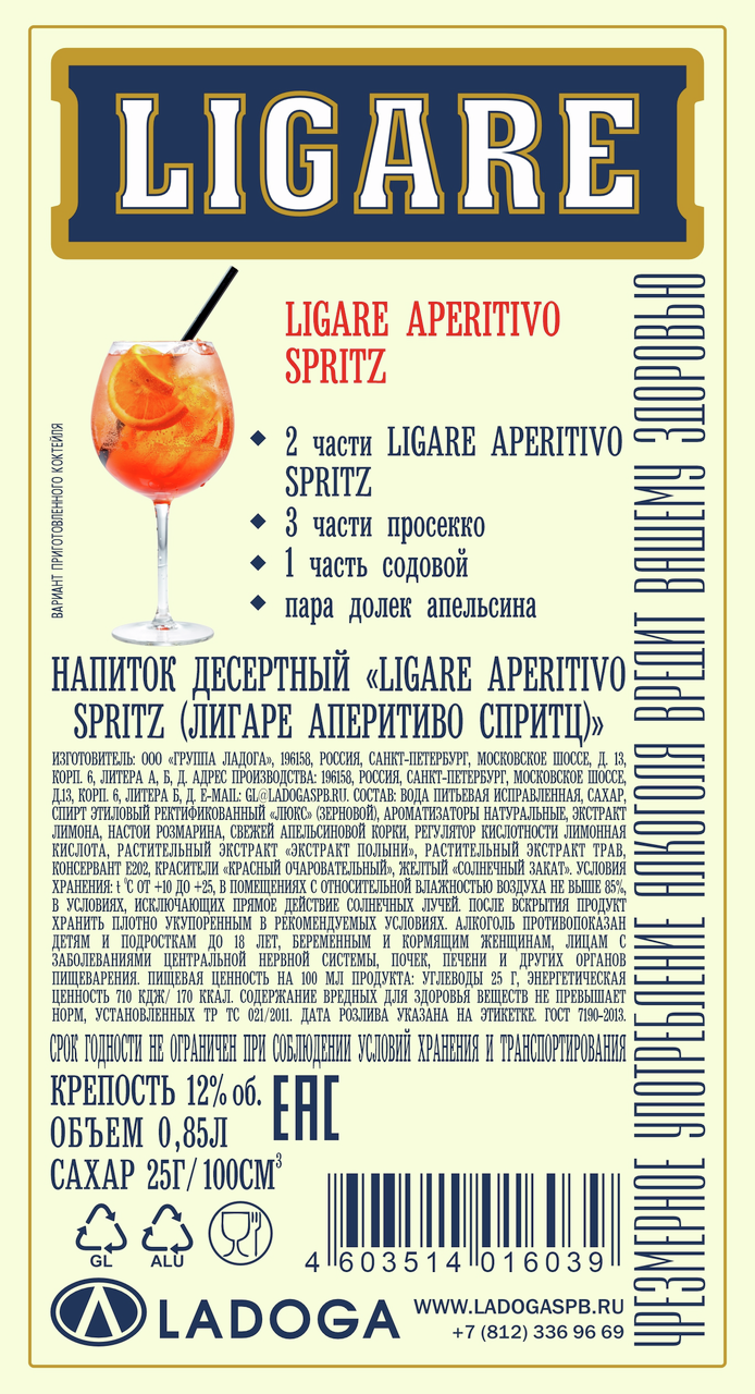 Классический аперитив, изготовленный по аутентичной итальянской рецептуре, веницианского аперитива Коктейль Ligare Spritz. 2 части Ligare Spritz, 3 части Prosecco, 1 часть газированная вода. Добавить лед и украсить долькой апельсина. В 2024г аперитив Лигаре Аперетиво Спритц получил право на использование знака Гранд Золото в конкурсе Expert Cup. Цвет ярко-оранжевый с красными вкраплениями. Аромат сложный, с выделяющимися тонами апельсина и легкими тонами трав. Вкус гармоничный, сладкий, с легкой горечью.