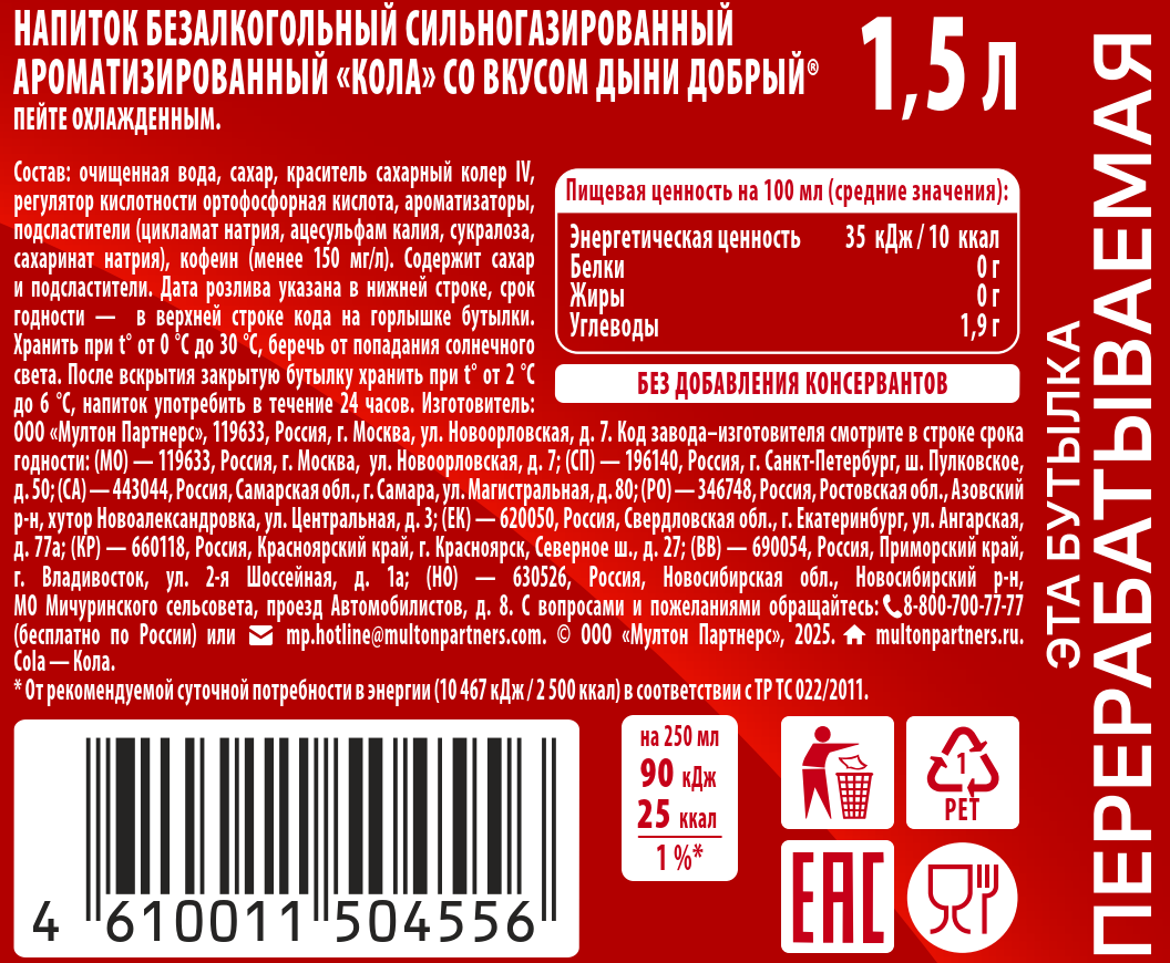Напиток Добрый Кола дыня газированный, 1.5л x 9 шт - это смелое сочетание яркого вкуса кола с ароматом спелой дыни. Заряд хорошего настроения, которым так хочется делиться с тем, кто рядом. Рекомендуется пить охлажденным.