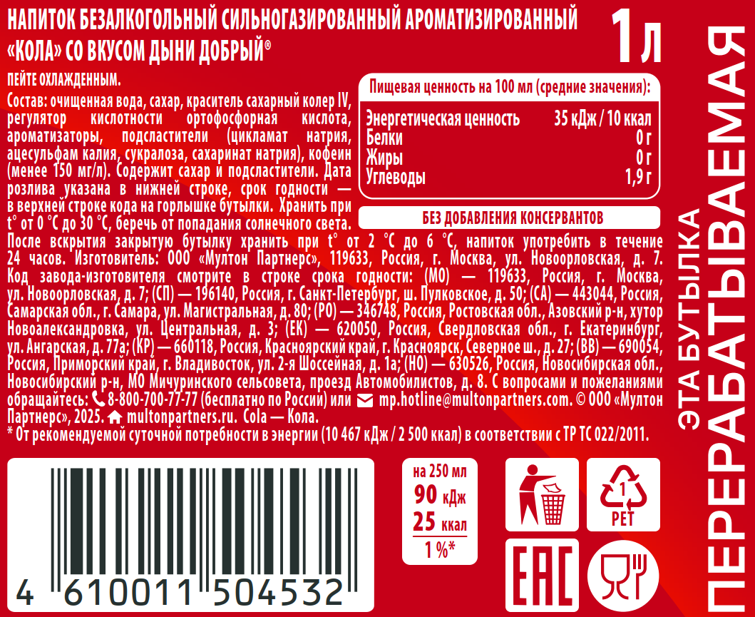 Напиток безалкогольный сильногазированный ароматизированный Кола со вкусом дыни Добрый - это смелое сочетание яркого вкуса кола с ароматом спелой дыни. Заряд хорошего настроения, которым так хочется делиться с тем, кто рядом. Рекомендуется пить охлажденным.