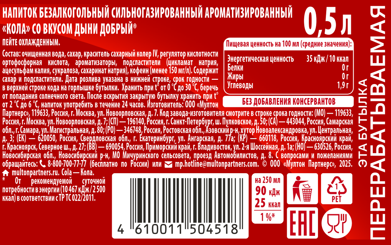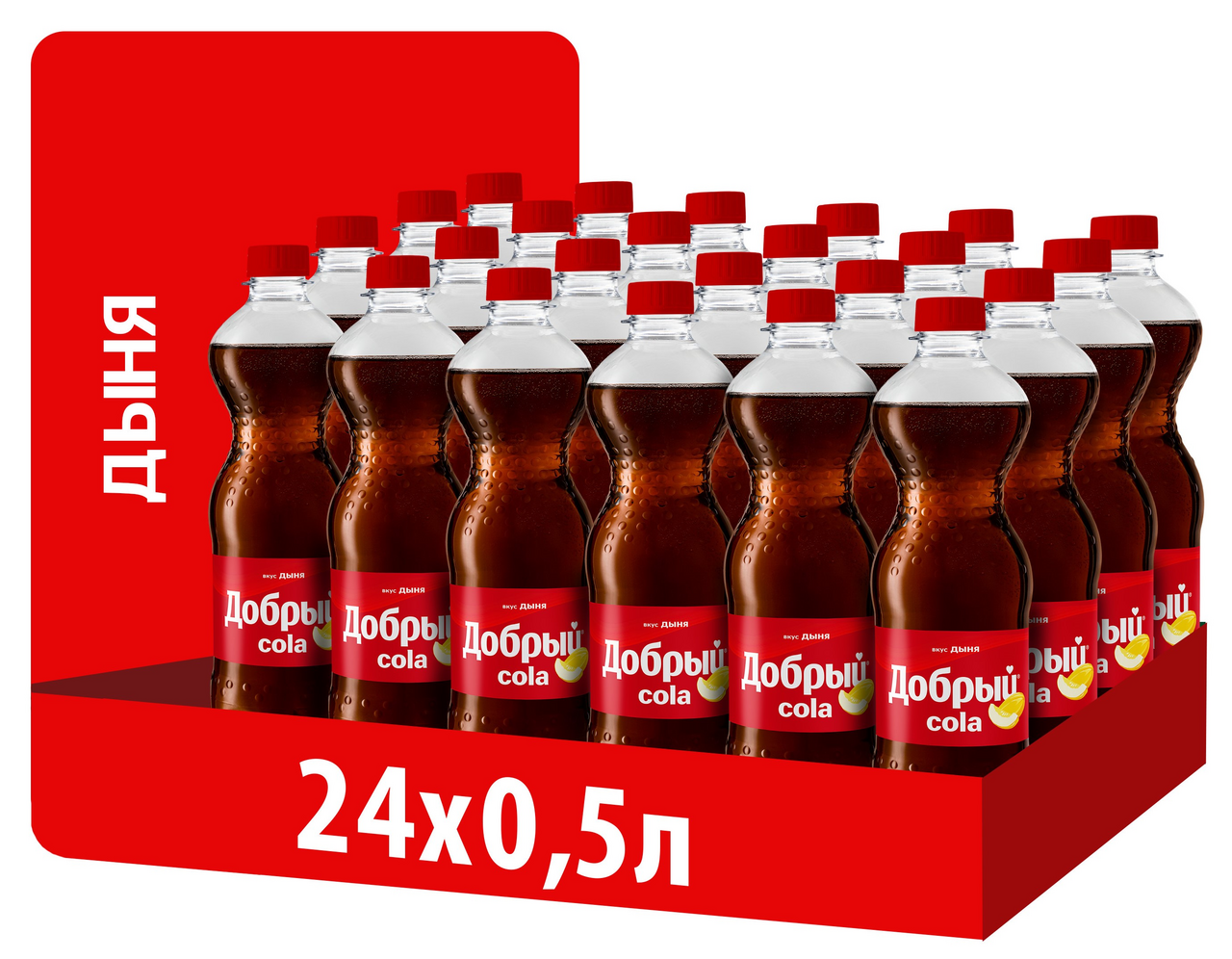 Напиток безалкогольный сильногазированный ароматизированный Кола со вкусом дыни Добрый - это смелое сочетание яркого вкуса кола с ароматом спелой дыни. Заряд хорошего настроения, которым так хочется делиться с тем, кто рядом. Рекомендуется пить охлажденным.