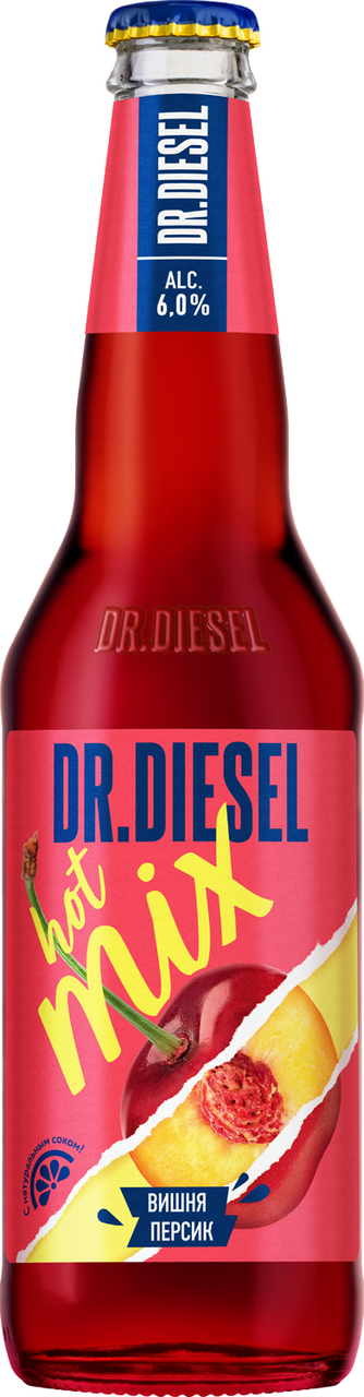Doctor Diesel – молодежный бренд фруктового пива для тех, кто ценит индивидуальность и не боится быть собой! Doctor Diesel Hot Mix – это насыщенное фруктовое пиво с оригинальным подходом к сочетанию ягодных и фруктовых нот. Ароматная садовая вишня идеально дополнена спелым персиком в напитке Doctor Diesel.