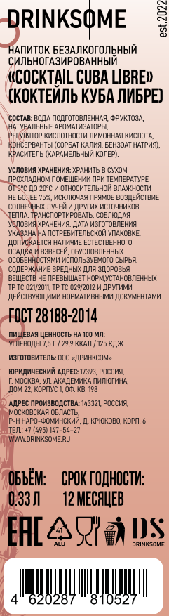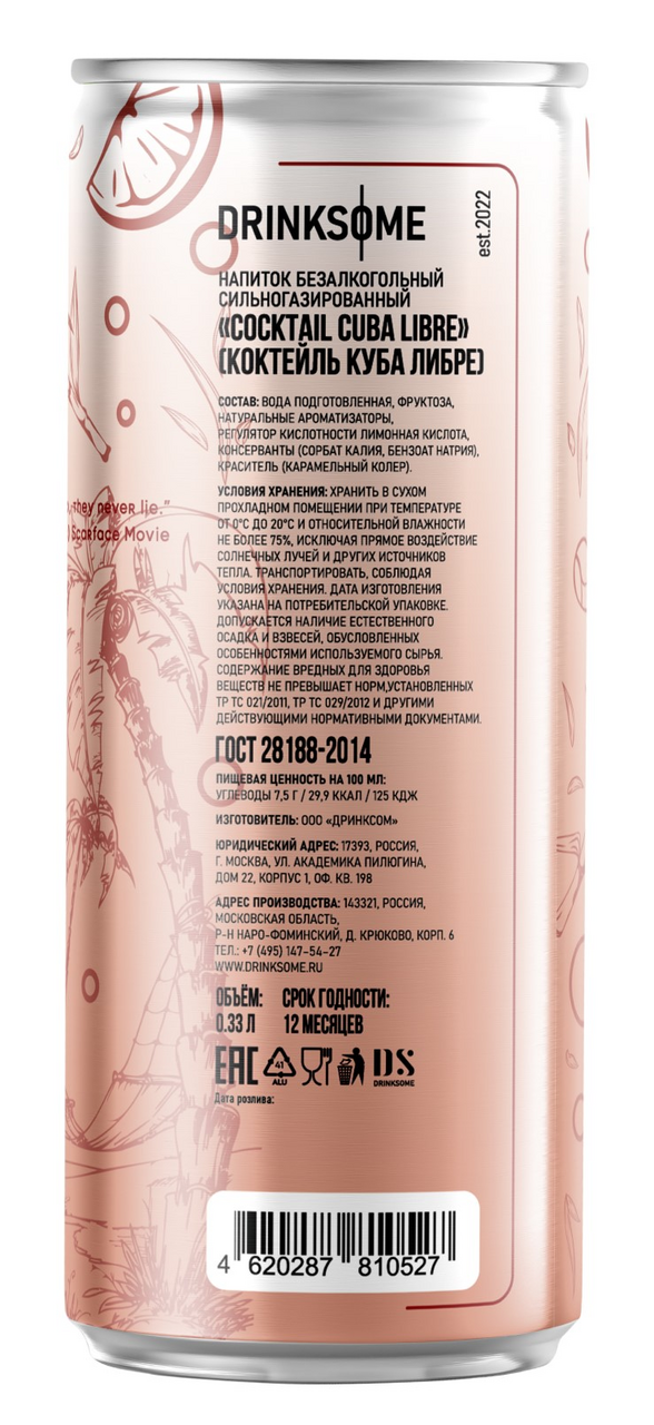 Напиток безалкогольный Drinksome Cocktail Cuba Libre Коктейль Куба Либре газированный, 330мл