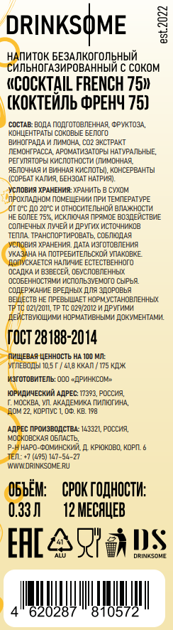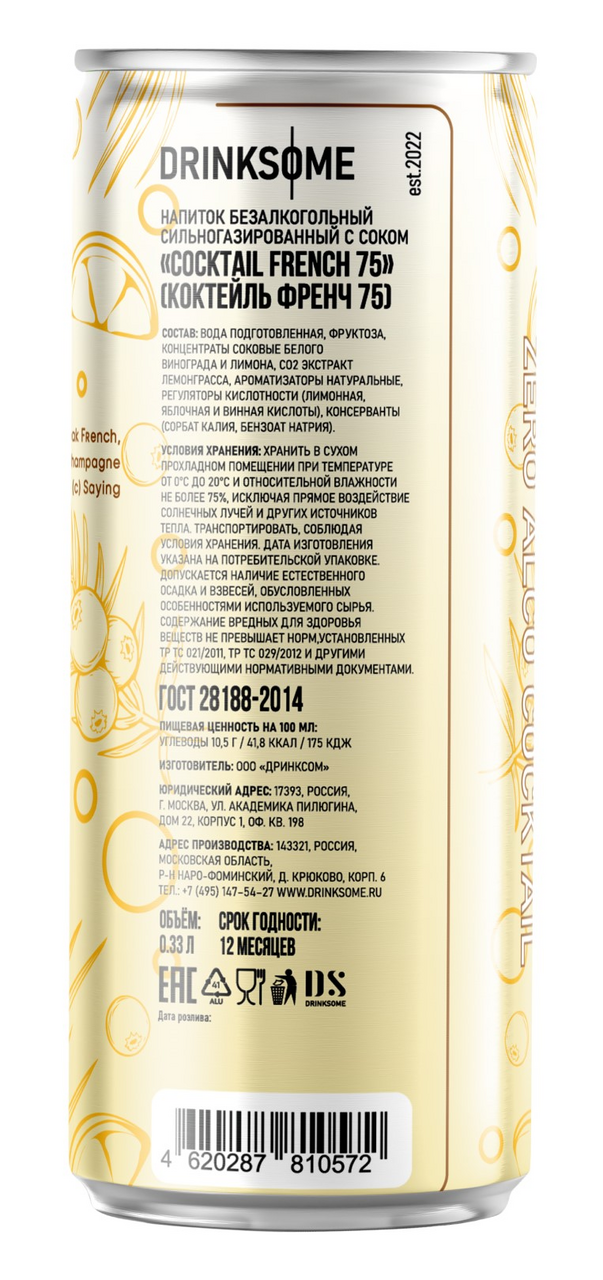 Напиток безалкогольный Drinksome Cocktail French 75 Коктейль Френч 75 газированный, 330мл