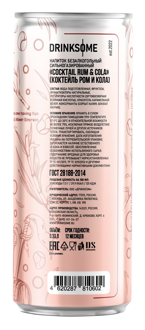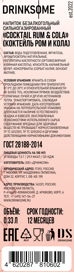 Напиток безалкогольный Drinksome Cocktail Rum&Cola Коктейль Ром и Кола газированный, 330мл