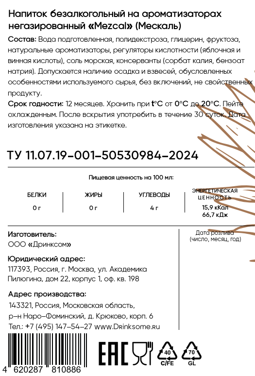 Напиток безалкогольный Drinksome Mezcal Мескаль негазированный, 0.7л