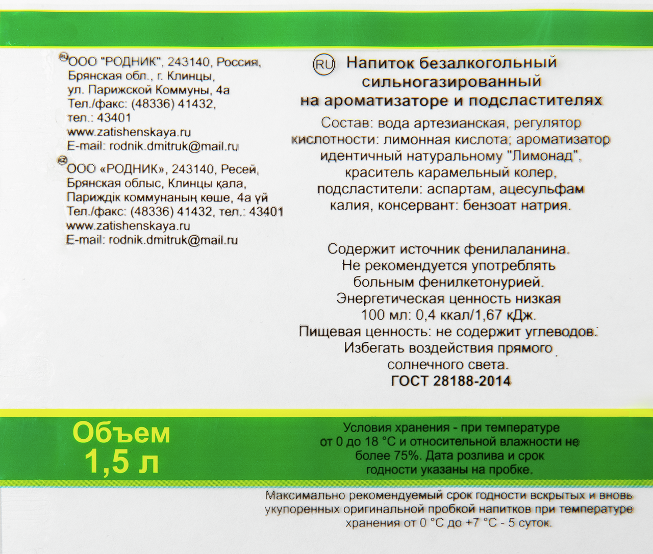 Вода артезианская, лимонная кислота, ароматизатор Лимонад, подсластители, консервант.