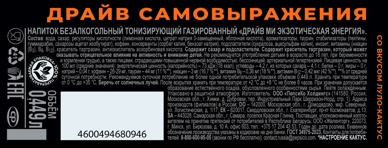 Напиток энергетический Drive Me Экзотическая энергия луло и кактус, 449мл