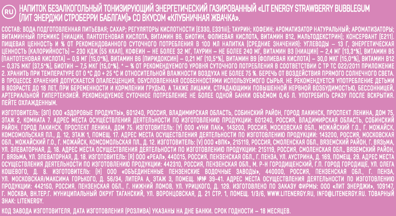 Напиток энергетический Lit Energy Клубничная жвачка, 450мл