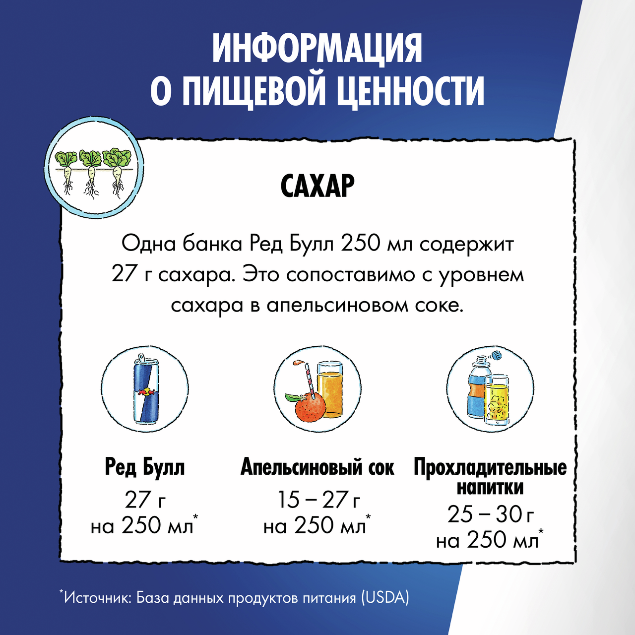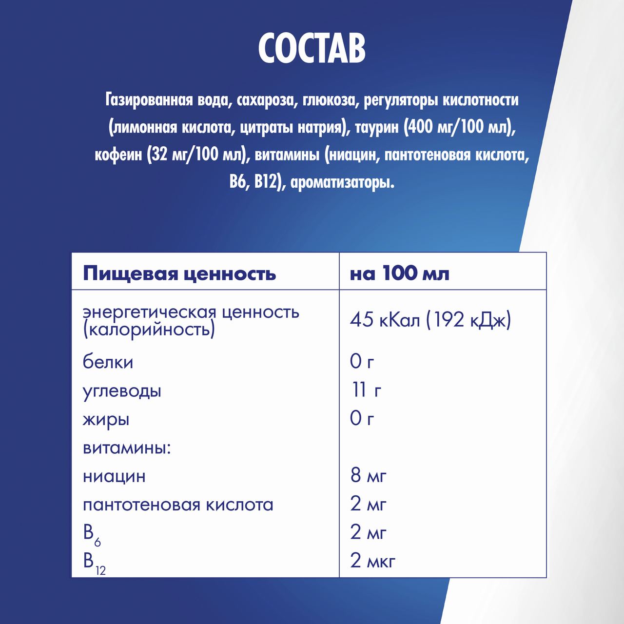 Газированная вода, сахароза, глюкоза, регуляторы кислотности лимонная кислота, цитраты натрия таурин, кофеин, витамины ниацин, пантотеновая кислота, В6, В12 ароматизаторы, красители антоцианы, рибофлавин.