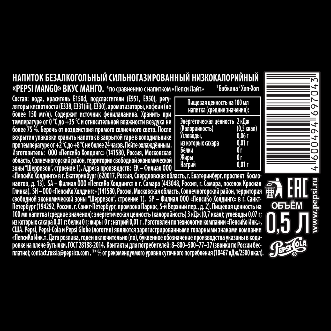 Напиток Пепси Манго - новая версия известного на весь мир безалкогольного прохладительного напитка с насыщенным вкусом манго●Безупречный вкус малины●Чувства переполняют, эмоции льются через край!Пепси Кола - легендарный напиток, изобретенный фармацевтом К. Бредхемом в 1893 году. Pepsi завоевал популярность по всему миру.