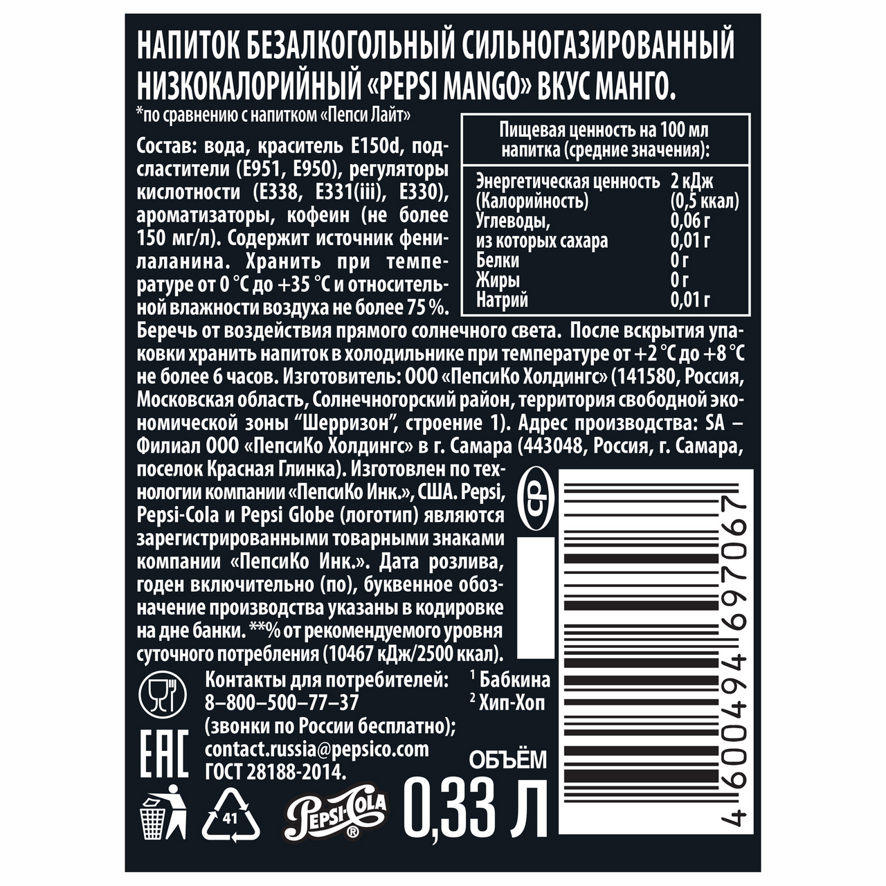 Напиток Пепси Манго - новая версия известного на весь мир безалкогольного прохладительного напитка с насыщенным вкусом манго●Безупречный вкус малины●Чувства переполняют, эмоции льются через край!Пепси Кола - легендарный напиток, изобретенный фармацевтом К. Бредхемом в 1893 году. Pepsi завоевал популярность по всему миру.