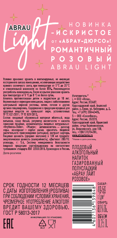 Напиток игристый Абрау Дюрсо Light розовое полусладкое, 0.25л