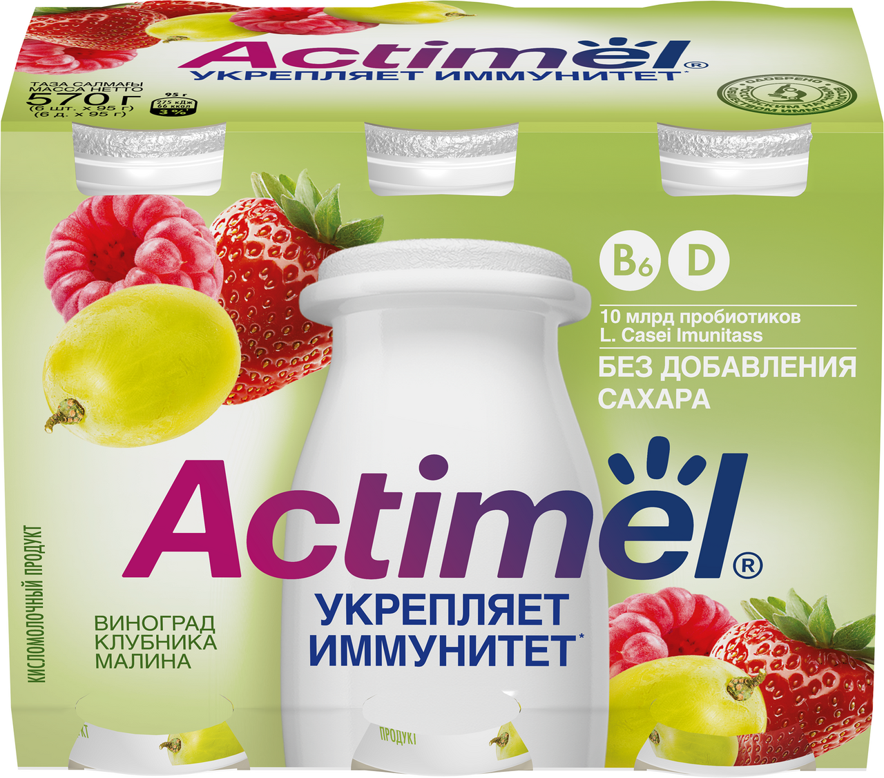 Напиток кисломолочный Actimel с виноградом, клубникой и малиной без сахара 2.2%, 100г х 6шт