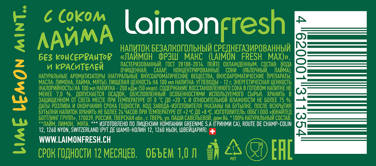 Напиток Laimon Fresh лайм, лимон и мята газированный, 1л