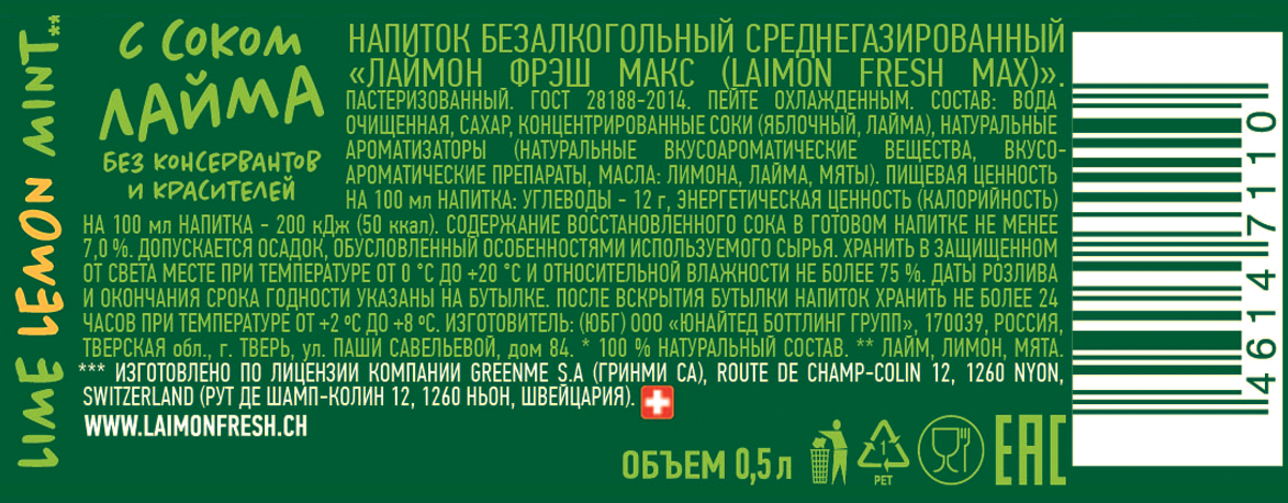 Напиток Laimon Fresh лайм, лимон и мята газированный, 500мл x 12 шт