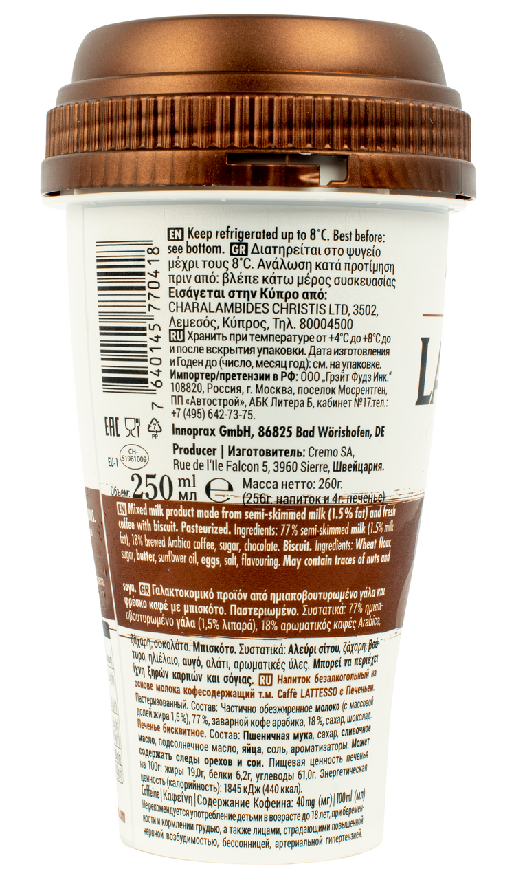 Секрет LATTESSO прост, как все гениальное: из уникального сочетания свежезаваренного эспрессо и первоклассного швейцарского молока рождается абсолютно натуральный напиток премиум-класса. Инновационная культура кофе от LATTESSO вдохновляет своим неповторимым вкусом и дарит бодрящие моменты удовольствия. В составе напитков LATTESSO нет никаких искусственных добавок, стабилизаторов, загустителей, эмульгаторов и сахара. Полностью натуральная рецептура возможна благодаря уникальной технологии сохранения свежести. Легкий кофейный напиток Cappucino изготовлен из безлактозного молока (жирность 1,2%) и подойдет даже тем, у кого лактозная непереносимость. Напиток Cappucino LATTESSO: - классический; - с шоколадом; - натуральный на 100%. Теперь любимым капучино можно насл��диться в любом месте, не отказывая себе в удовольствии!