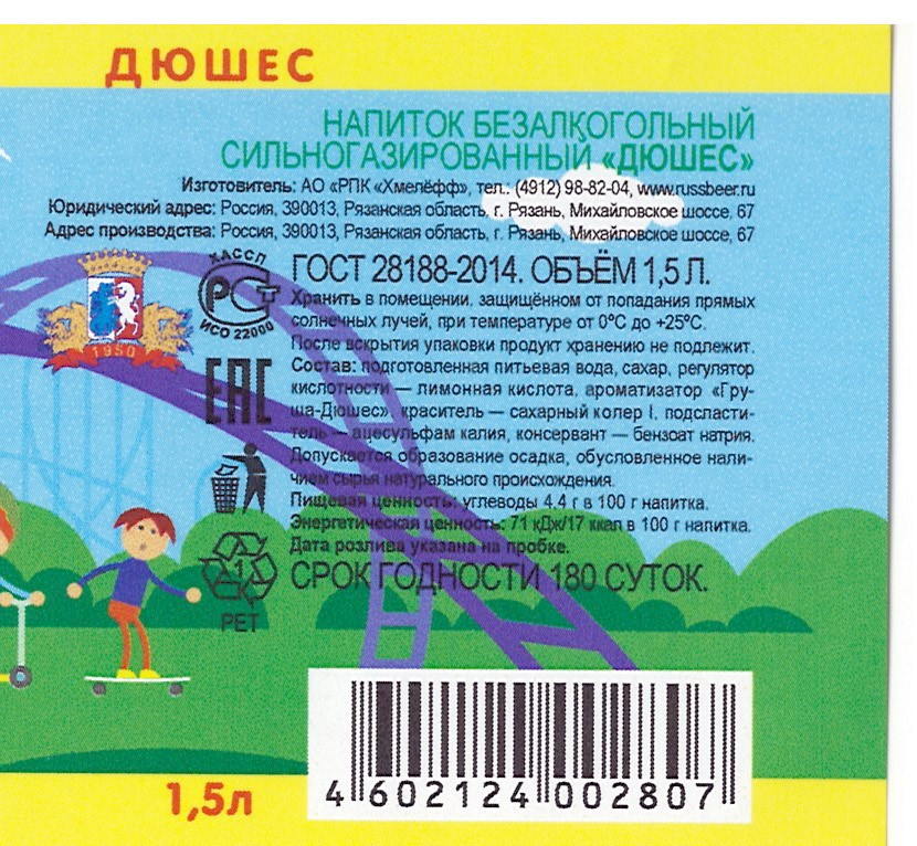 Подготовленная питьевая вода, сахар, регулятор кислотности лимонная кислота, ароматизатор Груша-Дюшес, краситель сахарный колер 1, подсластитель ацесульфам калия, консервант бензоат натрия.