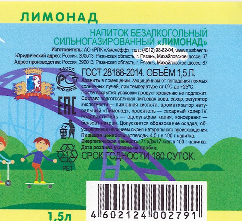 Подготовленная питьевая вода, сахар, регулятор кислотности лимонная кислота, ароматизатор натуральный Лимонад, краситель - сахарный колер 4, подсластитель ацесульфам калия, консервант бензоат натрия.