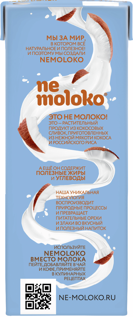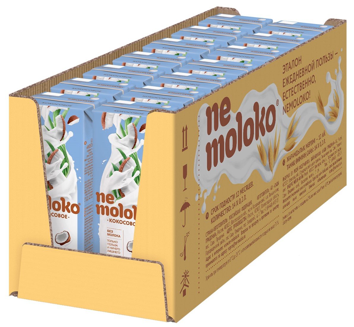 Nemoloko кокосовое - вкусная новинка для ежедневного потребления. Освежающий напиток в удобной порционной упаковке. Это универсальный продукт. Можно пить отдельно охлаждённым, на завтрак и в течение дня, добавлять в мюсли, готовить десерты и коктейли. Nemoloko кокосовое: - Имеет 100% растительное происхождение. - Легко усваивается. - Безопасен, в том числе и для людей с непереносимостью лактозы и аллергией на белок коровьего молока. Кокосовое молоко выступает одним из универсальных ингредиентов в тайской кухне. Его ценят за способность придавать насыщенную кремовую текстуру. Nemoloko кокосовое легко находит взаимопонимание с кофе, привносит легкий бархатистый оттенок вкуса. И в детское меню отлично дополняют Что же касается детского меню, то каши на нем получаются самыми нежными по структуре.