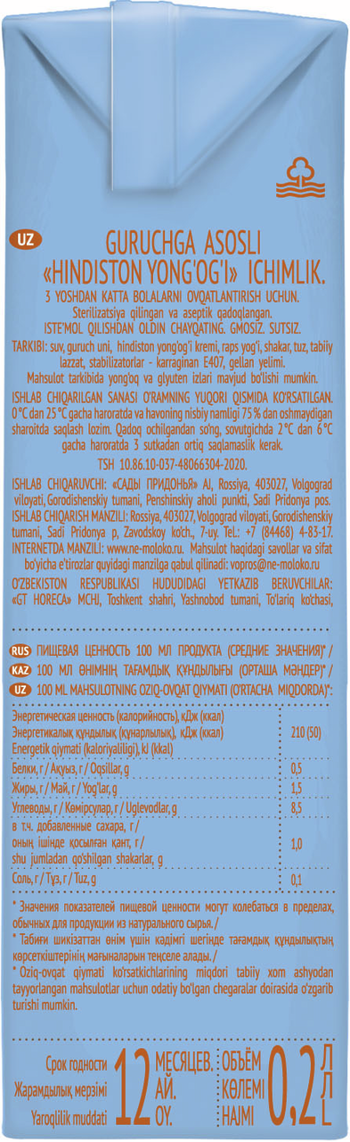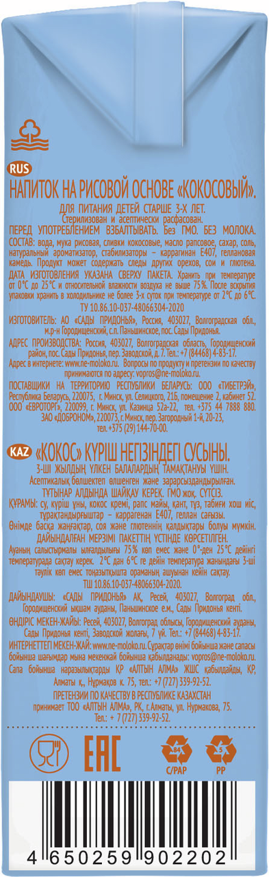 Вода, мука рисовая, сливки кокосовые, масло рапсовое, сахар, соль, натуральный ароматизатор, стабилизаторы – каррагинан, геллановая камедь.