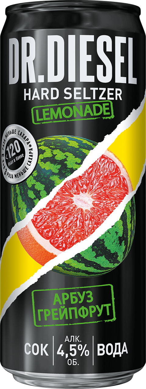 Напиток пивной Doctor Diesel арбуз-грейпфрут, 0.33л обладает необычным и ярким вкусом. Его оценят любители пивных коктейлей с нестандартными комбинациями. В качестве основы производитель использовал традиционное светлое пиво, сваренное по классической технологии из ячменного солода и хмеля. Продается в стандартной железной банке с привлекательным дизайном. Такую удобно брать с собой на прогулку, на пикник или в дорогу. Газировка приятно освежает, его хорошо пить в летнюю жару. Она отлично утоляет жажду. Употреблять можно соло или со снеками.Изготовлен пивной коктейль по оригинальной, специально разработанной рецептуре. Он порадует интересным вкусом. В нем присутствует характерная горчинка, легкая и непринужденная. Сладость арбуза отлично контрастирует с грейпфрутовой кислинкой. В гамме главенствует грейпфрут, арбузные тона различаются, легкая сладость и пивная горчинка едва заметны. Цвет насыщенный, в нем главенствует шикарный красный оттенок. Пузырьков довольно много (хорошая степень газации), пена невысокая, держится недолго, оседает постепенно. В аромате отчетливо ощущаются грейпфрутовые тона, изящные арбузные нюансы едва заметны. Чтобы в полной мере насладиться оригинальным вкусом и ароматом пенного напитка, наливать его стоит, придерживаясь следующих правил: стакан необходимо держать под углом 45 градусов; струю напитка направляйте на середину стакана; слишком медленно не стоит наливать пиво, иначе не будет крепкой пенной шапочки; как только бокал наполнится наполовину, поставьте его вертикально; если пены оказалось слишком много (более 2-4 см), значит, напиток наливали слишком быстро и был неправильно выбран угол. Для напитка лучше всего использовать специальный пивной бокал или кружку – обычно объем такой посуды не меньше 0,3 л. Внутри сосуд должен иметь гладкие стенки, чтобы напиток мог стекать плавно. Приобрести напиток пивной Doctor Diesel арбуз-грейпфрут, 0.33л можно в торговом центре METRO.Бренд: Доктор Дизель Хард Зельцер; производитель: ООО Объединенные пивоварни Хейнекен; страна: Россия; тип продукта: пивной напиток; состав: пивное сусло (вода питьевая очищенная, солод пивоваренный ячменный светлый, хмелепродукты), глюкозно-фруктозный сироп, сахар, концентрированные соки: черной моркови, арбуза, розового грейпфрута, регулятор кислотности – лимонная кислота, ароматизаторы натуральные; цвет: осветленное; фильтрация: фильтрованное; пастеризация: пастеризованное; сырье: ячменное; крепость: 4,5 %; потребительская тара: ж/б.Меры предосторожности: алкоголь противопоказан детям и подросткам до 18 лет, беременным и кормящим женщинам, лицам с заболеваниями центральной нервной системы, почек, печени и других органов пищеварения. Чрезмерное употребление алкоголя вредит здоровью.