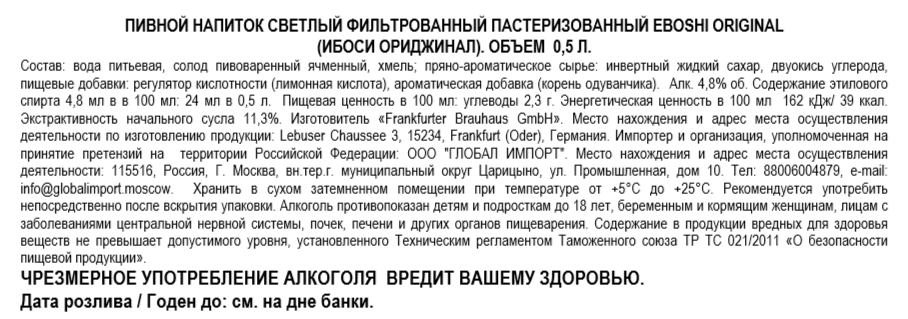 Напиток пивной Eboshi Original светлое, 0.5л