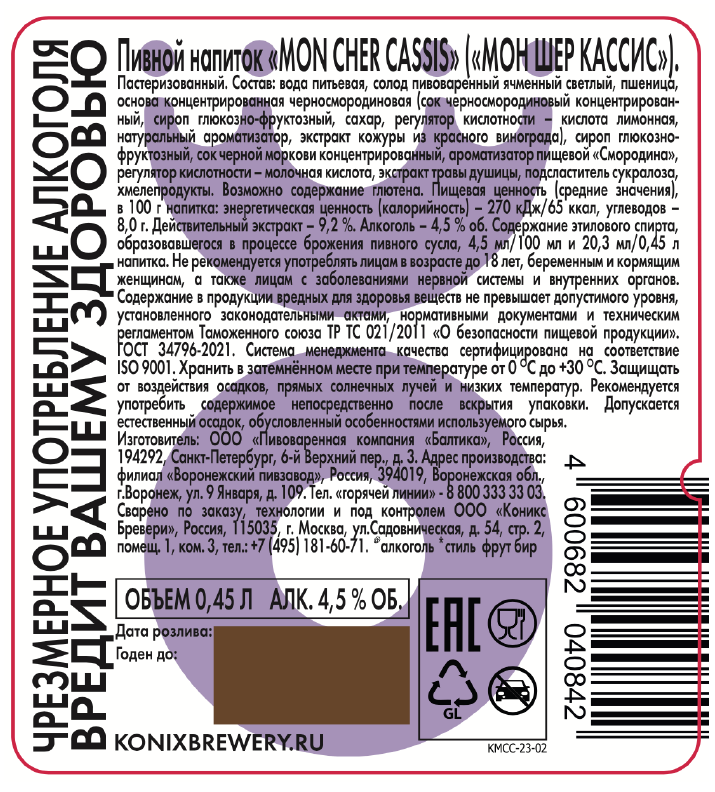 Напиток пивной Konix Brewery Mon Cher Cassis, 0.45л