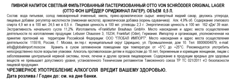 Напиток пивной Otto Von Schrodder Original лагер светлое, 0.5л