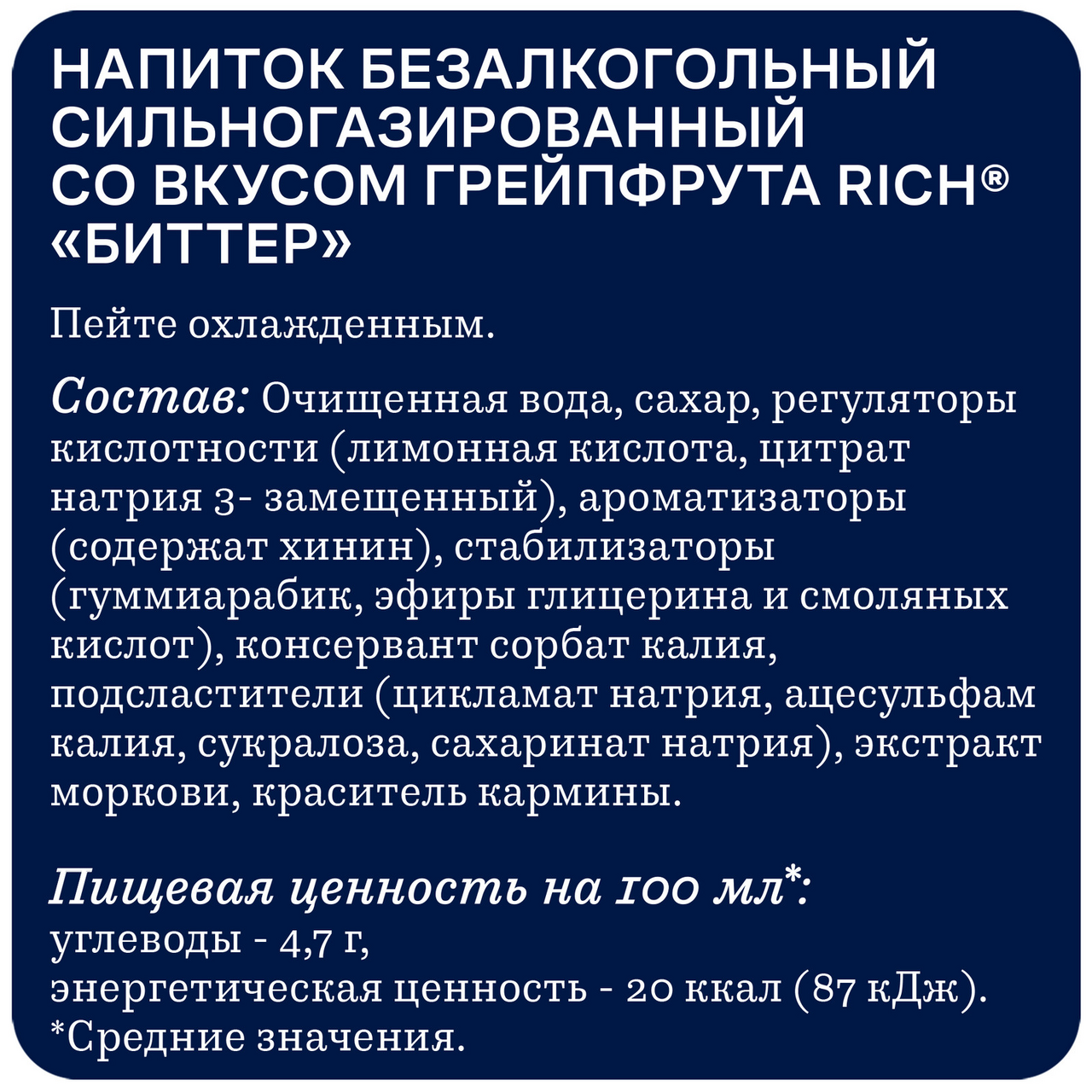 Очищенная вода, сахар, регуляторы кислотности (лимонная кислота, цитрат натрия 3- замещенный), ароматизаторы (содержат хинин), стабилизаторы (гуммиарабик, эфиры глицерина и смоляных кислот), консервант сорбат калия, подсластители (цикламат натрия, ацесульфам калия, сукралоза, сахаринат натрия), экстракт моркови, краситель кармины.