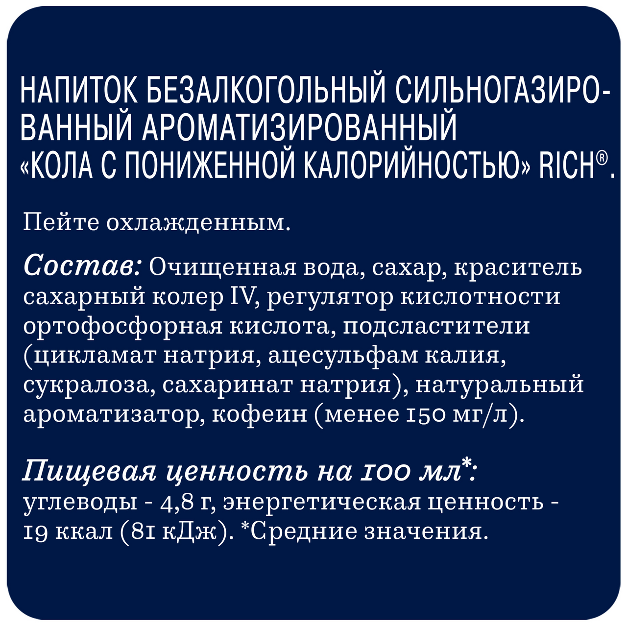 Напиток Rich Кола газированный, 1л x 12 шт - яркий вкус колы для настоящих ценителей оставляет освежающее приятное послевкусие! Новый вкус идеален как самостоятельный напиток, так и в качестве ингредиента для коктейлей. Подача напитка в бокале большой емкости помогает раскрыть ароматы и характеристики Rich Cola. Рекомендуется дополнить кубиками льда: чем крупнее кубики, тем меньше вероятность того, что он растает. Так кола будет охлажденной, но не разбавленной водой. По желанию можно добавить дольку лимона: лимонная цедра придает напитку дополнительный тонкий аромат.