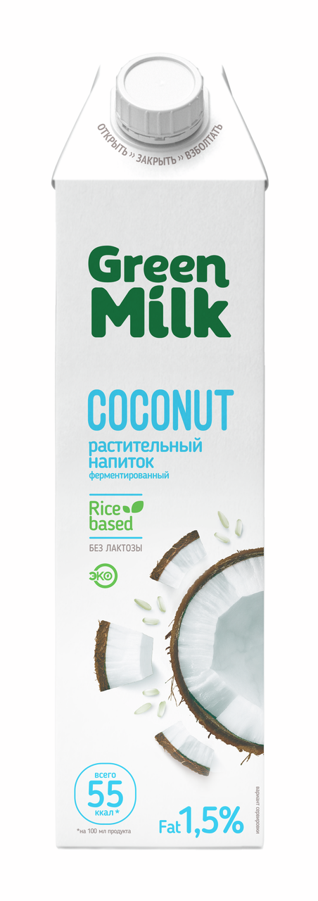 Green Milk Кокос — сладкий, нежный, ароматный напиток из мякоти зрелого кокоса. Без добавления сахара, без лактозы. Хорошо взбивается для молочных коктейлей. Рисовая основа напитка позволяет не добавлять сахар, так как содержит нативные сахара. Представляет собой альтернативу животному молоку. Напиток обладает приятным вкусом, его можно добавлять в каши, десерты, выпечку или употреблять самостоятельно.