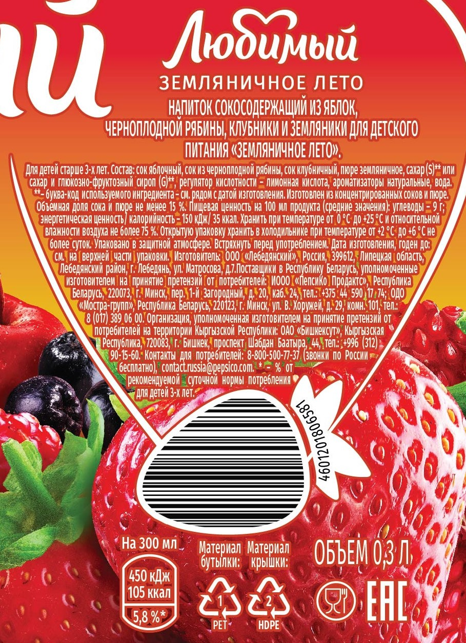 Напиток сокосодержащий Любимый Земляничное лето из яблок, черноплодной рябины, клубники и земляники, 300мл х 6 шт