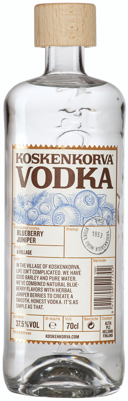 Это финская водка премиального класса, впитавшая в себя вкусы и ароматы уникальных скандинавских лесов. Эта водка производится из отборного местного ячменя, местной родниковой воды и натуральных экстрактов можжевеловых ягод и черники. Напиток перегоняется с помощью современного процесса непрерывной дистилляции 250 раз и именно по этой причине является одной из самых чистых водок в мире, не требующей отдельной угольной фильтрации. Добавление растительных экстрактов обогащает вкус водки и дарит краски настоящего северного леса. Название водки происходит от небольшой деревни Коскенкорва, которая расположена на юго-западе Финляндии. На протяжении многих десятилетий фермеры выращивают ячмень сортов Saana и Elmeri, который в сочетании с родниковой водой дают чистейшую, мягкую водку.