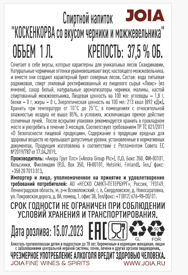 Вода питьевая родниковая, спирт этиловый ректификованный из пищевого сырья Люкс (из ячменя), сахар белый, натуральные ароматизаторы черники, малины, настой спиртованный можжевельника.
