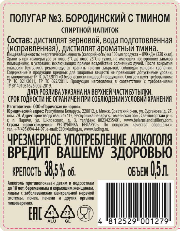 Напиток спиртной Полугар №3 Бородинский с тмином, 0.5л