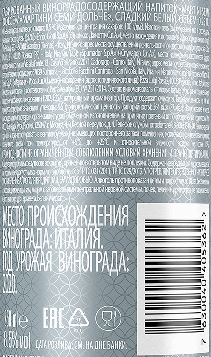 Газированный винный напиток с приятным сладковатым вкусом и тонким перляжем, для изготовления которого используют виноматериалы столовые белые и концентрированное виноградное сусло. Полусладкая версия игристого "Martini" с умеренным содержанием алкоголя особенно придется по вкусу девушкам. Разлитый в жестяные банки "Martini" Semi Dolce удобно взять с собой, куда бы Вы не отправились, будь то пикник или прогулка. Напиток идеален в чистом виде в качестве аперитива, а также в паре с фруктовыми салатами и десертами, свежими фруктами, выпечкой.