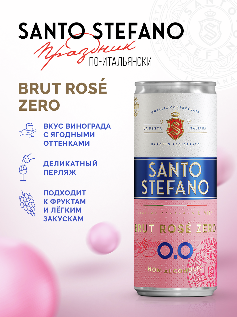 Наслаждайся без ограничений! Santo Stefano Zero Brut Rose - розовое сухое безалкогольное игристое. Всем любителям шампанского и тем, кто любит безалкогольное игристое вино, понравится новинка от легендарного бренда — изысканное безалкогольное игристое в удобном формате банки объемом 0,25л. Идеальный напиток 0% для ценителей ЗОЖ, водителей и тех, кто не пьет алкоголь. Санто Стефано Брют Розе — это розовое полусладкое безалкогольное игристое, которое покоряет с первого глотка. Напиток обладает чистым вкусом винограда с тонкой фруктовой сладостью и цветочным ароматом. Легкий перляж подчеркивает свежесть, а послевкусие раскрывается ягодной кислинкой. Это вкусное, с деликатными пузырьками, розовое игристое без алкоголя оценят даже самые взыскательные гурманы. Минимум калорий и максимум удовольствия! Идеально для любого повода: Новый год, свадьба, день рождения, корпоратив или романтический вечер. Нас выбирают беременные и те, кто за рулем. Дарите себе и близким праздник без последствий и похмелья! Наслаждайтесь каждым моментом без ограничений с Santo Stefano Zero!