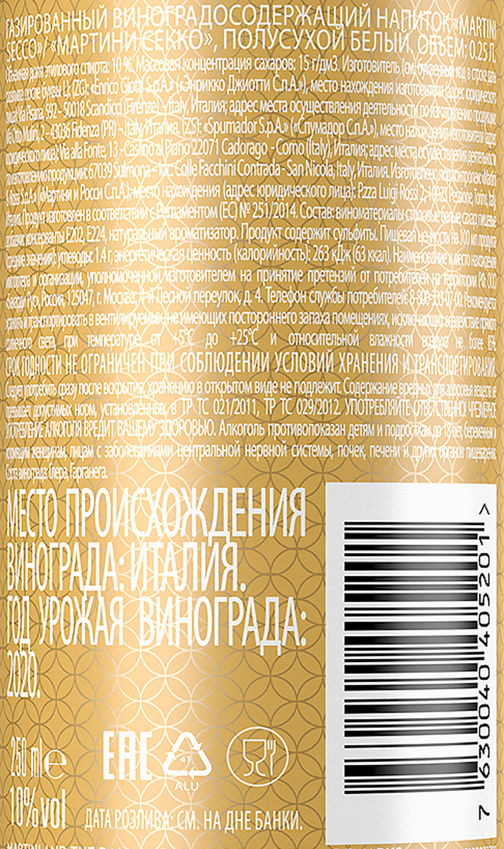 Martini Secco— газированный белый полусухой винный напиток с приятным фруктовым ароматом и свежим, легким, бодрящим вкусом. Напиток изготавливается из винограда сортов Глера и Гарганега. Игристое вино представлено в современном формате — жестяной банке объемом 0,25 л, которую удобно взять с собой, куда бы Вы не отправились, будь то пикник или прогулка. Напиток идеален в чистом виде в качестве аперитива, прекрасно подходит для изготовления коктейлей.