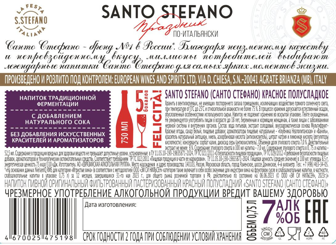 Напиток винный Santo Stefano красный полусладкий, 0.75л