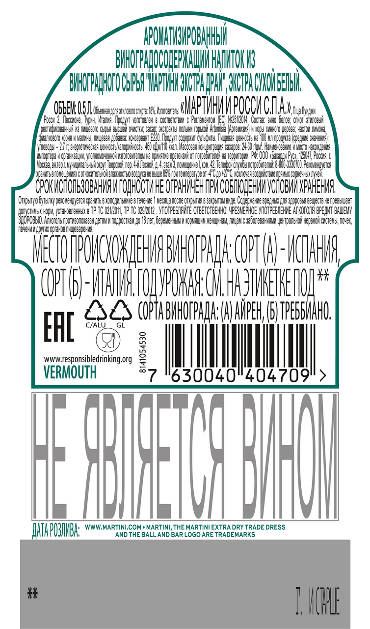 Напиток виноградосодержащий Martini Extra Dry из виноградного сырья белый сухой, 0.5л