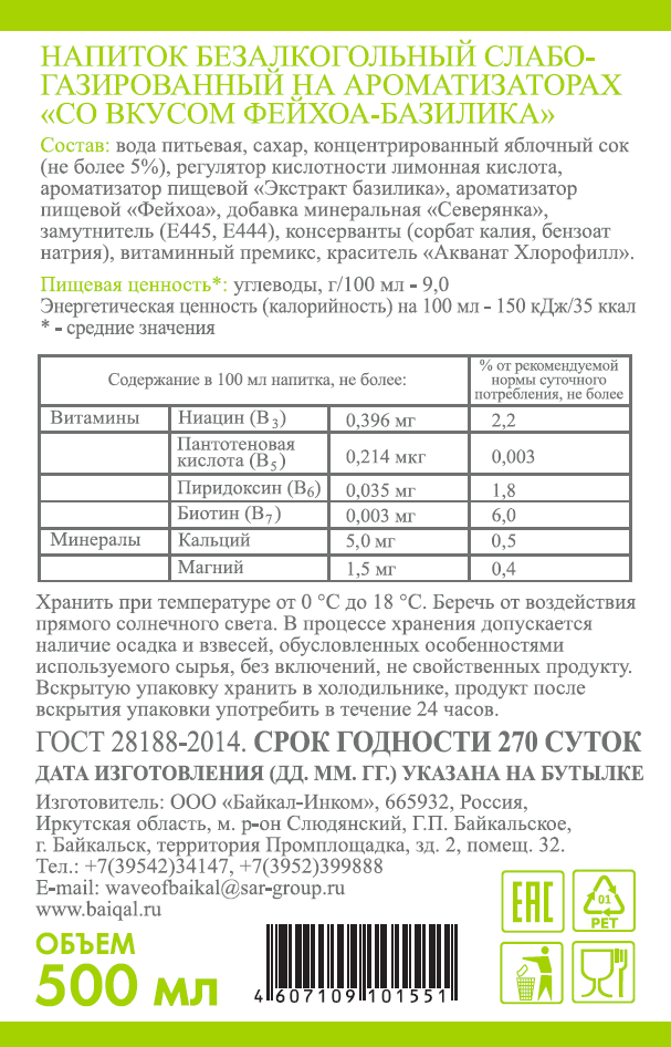 Вода питьевая, сахар, концентрированный яблочный сок, регулятор кислотности лимонная кислота, ароматизатор пищевой Экстракт базилика, ароматизатор пищевой Фейхоа, добавка минеральная Северянка, замутнитель Е445, Е444, консерванты сорбат калия, бензоат натрия, витаминный премикс, краситель Акванат Хлорофилл.
