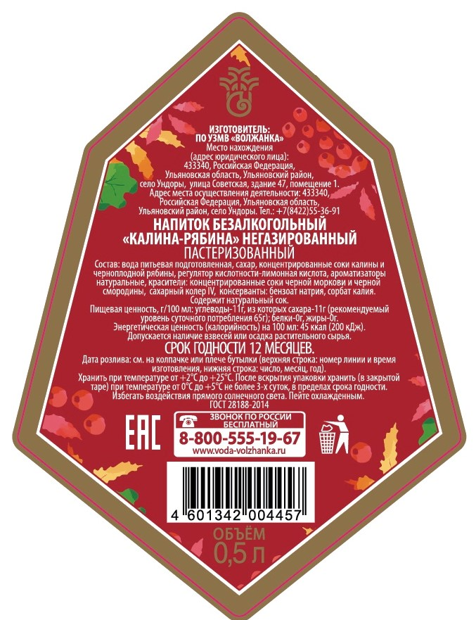 Напиток Волжанка калина-рябина негазированный, 500мл