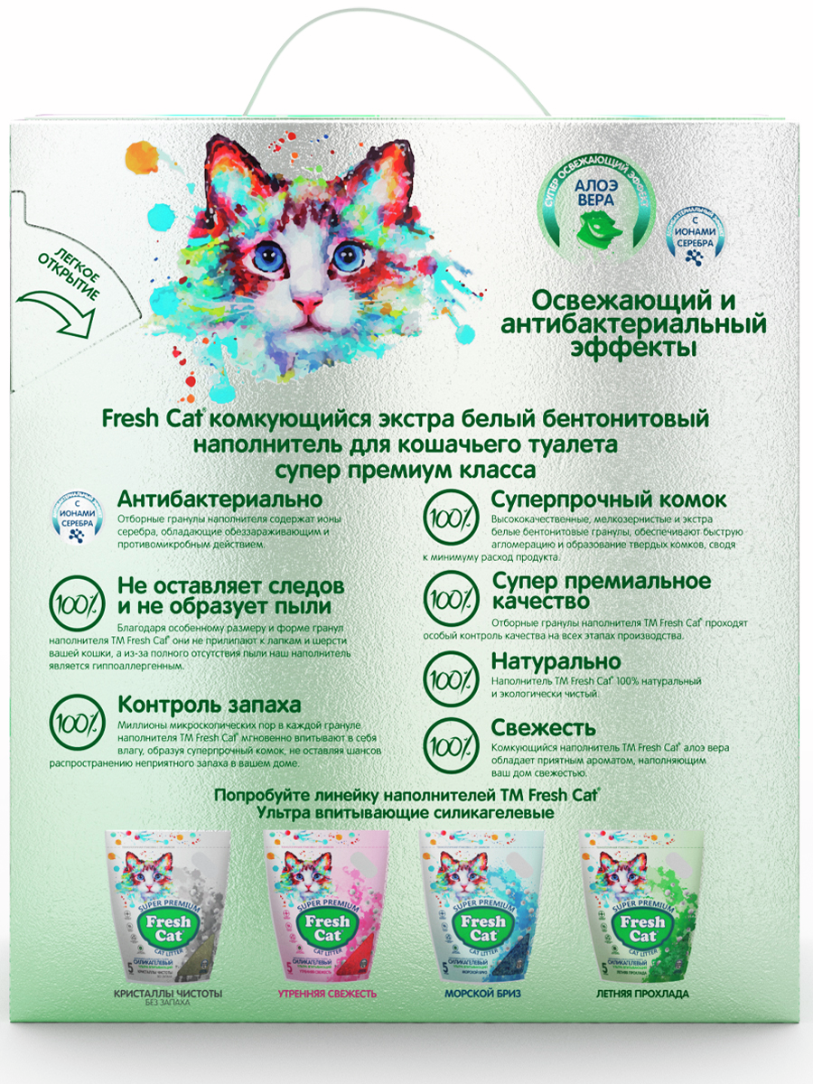 Комкующийся наполнитель Aloe Vera от Fresh Cat относится к продуктам супер-премиум-качества. Его основа — обеспыленные глиняные гранулы, содержащие в себе ионы серебра и обладающие антимикробными свойствами. Их размер и форма продуманы так, чтобы наполнитель не прилипал к лапам и шерсти питомца. Из-за отсутствия пылевых частиц наполнитель полностью гипоаллергенен. Комкующаяся структура служит полному поглощению запахов. Когда на гранулы попадает влага, появляется легкий аромат алоэ вера.